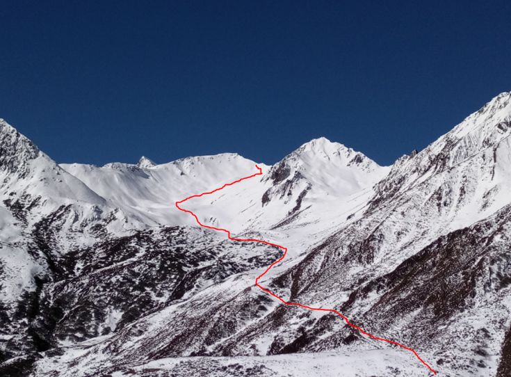 缓坡走完,我面临两个选择。一是从4836峰正面的雪坡直上,坡度陡且雪很松软;二是先切上左侧的山脊,再沿着山脊登顶。我选择了后者,至少山脊的坡度看着要亲切一些。