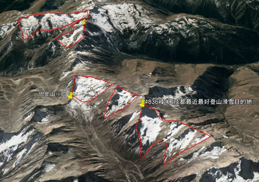 ►► 以上文的2、3、4、5为准则,借助Google地球的帮助,我们可以梳理出四川西部以下一些适合在春季滑野雪的地方(不包括半脊、那玛等已为人熟知的拥有永久冰川的山峰):